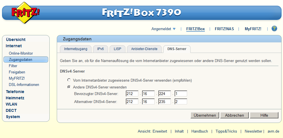 Da die FritzBox es dem Benutzer erlaubt, bei Bedarf auch eigene DNS-Server anzugeben, statt die vom Provider vorgeschlagenen zu verwenden, haben wir kurzerhand die DNS-Server eingetragen, die unsere mobile Außenstelle (anderer Provider) verwendet: