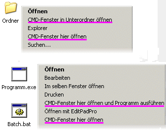 Win2000, WinXPDOS-Box (Eingabeaufforderung) aus dem Kontextmenü aufrufen![]() Viele Vorgänge unter Windows lassen sich nach wie vor wesentlich komfortabler an der Eingabeaufforderung durchführen. Insbesondere aber für jemanden, der viel mit Batch-Dateien arbeitet und/oder beispielsweise in C++ programmiert und seine compilierten EXE-Dateien testen will, wären ein paar kleine Kniffe im Umgang mit der DOS-Box sehr hilfreich. Von Hause aus hat die DOS-Box - zumindest unter den neueren Windows-Versionen - nämlich die Angwohnheit, sich sofort wieder zu schließen, sofern sie durch ein Batch-Skript o.ä. initiiert wurde, das beendet ist. Eigentlich ist das sogar ganz praktisch, denn man muß das DOS-Fenster nicht noch von Hand schließen. Aber zum Testen beispielweise von selbstgeschriebenen Batch-Skripten oder compilierten Programmen ist es doch schon hilfreich, wenn man eventuelle Fehlermeldungen mitbekommt, bevor das Fenster sich wieder verabschiedet. Die Lösung ist prinzipiell auch nicht allzu schwer, denn wenn man mittels Befehl oder Verknüpfung auf die command.com (Windows 9x) bzw. cmd.exe (Windows 2000 usw.) zuerst die DOS-Box startet und aus dieser heraus sein Progrämmchen aufruft, bleibt das Fenster geöffnet. Nun startet die DOS-Box aber immer in ihrem vorgegebenen Standard-Verzeichnis, und man muß von Hand per CD-Befehl zu seinem Arbeitsverzeichnis navigieren. Wer das bei der Entwicklung eines Programms o.ä. ca. 500 mal am Tag gemacht hat, der hat dann doch schonmal angefangen, nach einer Abhilfe zu brüllen. Und hier ist sie! Mit ein paar kleinen Einträgen in der Registry kann die DOS-Box nun aus dem Kontextmenü einer jeden Datei und eines jeden Ordners an genau der Stelle gestartet werden, an der sich die angeklickte Datei bzw. der angeklickte Ordner befindet. ![]() CMD-Fenster hier öffnen CMD-Fenster in Unterordner öffnen Wird das Kontextmenü einer Datei aufgerufen, stehen folgende zusätzlichen Einträge zur Auswahl: CMD-Fenster hier öffnen CMD-Fenster hier öffnen und Programm ausführen Und die DOS-Box bleibt auch offen, wenn der Eintrag "CMD-Fenster hier öffnen und Programm ausführen" ausgewählt und somit das angeklickte Programm gestartet wurde. Download der *.reg-Datei - UAP -
