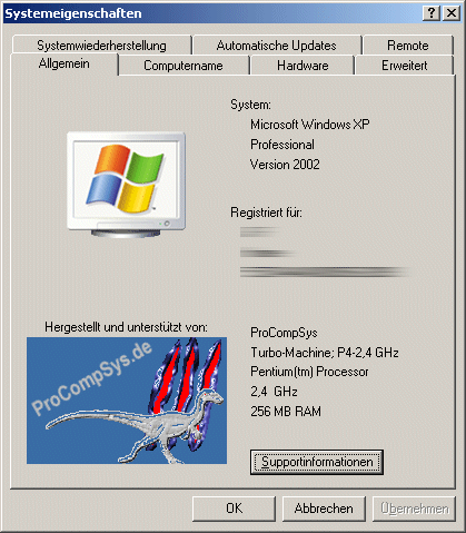 Klickt man mit der rechten Maustaste auf den Arbeitsplatz und wählt aus dem Kontextmenü "Eigenschaften", erscheinen diverse Informationen über den PC. Je nach Lust und Laune des PC-Händlers kann er hier auch Informationen und ein Logo von sich selbst eingetragen haben.