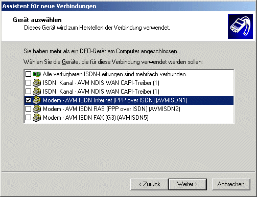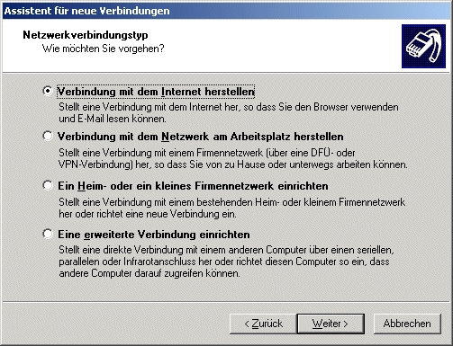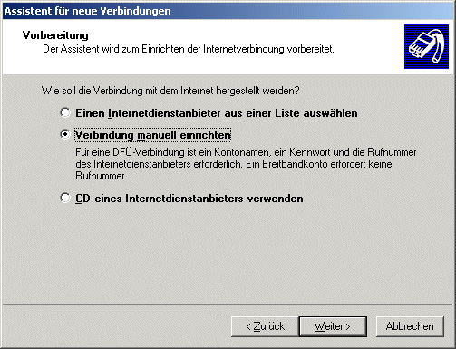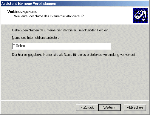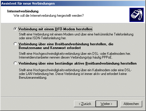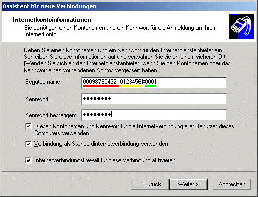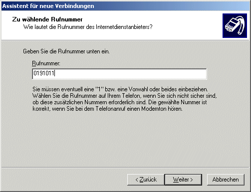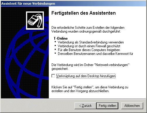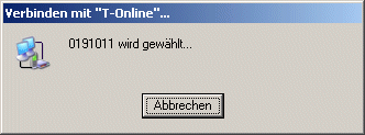 Anschluß-Nummer Anschluß-Kennung Kennwort Einrichten der DFÜ-Verbindung unter Windows XPMit einem Doppelklick auf "Assistent für neue Verbindungen" im Ordner "Netzwerkverbindungen" (erreichbar über die Systemsteuerung) startet man zunächst den Verbindungsassistenten.![]() Im 1. Dialog wählt man den ersten Punkt "Verbindung mit dem Internet herstellen". ![]() Im 2. Dialog wählt man den zweiten Punkt "Verbindung manuell einrichten". ![]() Im 3. Dialog wählt man im Falle einer Verbindung per analogem Modem bzw. ISDN den ersten Punkt: "Verbindung mit einem DFÜ-Modem herstellen". Haben Sie einen DSL-Anschluß und verwenden ein DSL-Modem, wählen Sie den zweiten Punkt: "Verbindung über eine Breitbandverbindung herstellen, die Benutzername und Kennwort erfordert". ![]() Im 4. Dialog wählt man das zu verwendende Modem aus. Bei ISDN-Modems ist standardmäßig der erste Eintrag für die Kanal-Bündelung aktiviert. Dabei werden zwei ISDN-Leitungen verwendet, die natürlich auch doppelt zu Buche schlagen. Will man nur eine Leitung verwenden, wählt man einen anderen Eintrag aus der Modem-Liste. Dieser Punkt entfällt im Falle eines DSL-Anschlusses. ![]() Im 5. Dialog wählt man einen beliebigen Namen für die Verbindung (z.B. "T-Online") ![]() Im 6. Dialog ist die Rufnummer von T-Online einzutragen. Hier genügt es, die deutschlandweit verfügbare Rufnummer 0191011 einzutragen. Dieser Punkt entfällt im Falle eines DSL-Anschlusses. ![]() Im 7. Dialog müssen Benutzername und Kennwort für die Verbindung angegeben werden. Der Benutzername setzt sich dabei aus den verschiedenen Nummern zusammen, die man als T-Online-Mitglied auf der Auftragsbestätigung findet. Als erstes ist die zwölfstellige Anschlußkennung (z.B 000987654321) in das Feld "Benutzername" einzutragen. Direkt anschließend daran, ohne Leerzeichen o.ä., ist die T-Online-Nummer zu tippen (z.B 0123456). Ist diese Nummer kürzer als 12 Ziffern, so ist danach ein "#"-Zeichen einzufügen. Schließlich geben Sie jetzt noch Ihre Mitbenutzernummer - meist Mitbenutzer-Suffix genannt - an (normalerweise "0001"). Im nächsten Feld ist jetzt noch ihr achtstelliges Kennwort einzutragen und im darauffolgenden Feld nochmals zu bestätigen. Im Falle eines DSL-Anschlusses setzt sich der Benutzername etwas anders zusammen. Hier muß im Anschluß an das Mitbenutzer-Suffix noch "@t-online.de" angehängt werden. ![]() Im letzten Dialog läßt sich noch auswählen, ob eine Verknüpfung zum DFÜ-Eintrag auf den Desktop gelegt werden soll. ![]() Nach dem Klicken auf "Fertigstellen" öffnet sich das Verbindungsfenster. Mit einem Klick auf "Wählen" wird die Verbindung hergestellt. ![]() - UAP -
