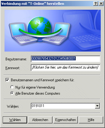 Suchbegriffe für diese Seite: T-Online, Software, T-Online-Software, DFÜ, DFÜ-Netzwerk, DialUp, Dial-Up, Verbindung, Benutzername, Kennwort, Zugangsdaten, T-Online-Nummer, Anschluß-Nummer, Anschluß-Kennung |