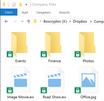 Bei Verwendung der Software "Boxcryptor" wird der Smart-Sync-Status von Dateien und Ordnern im Boxcryptor-Laufwerk mit einem grünen Vorhängeschloß dargestellt: