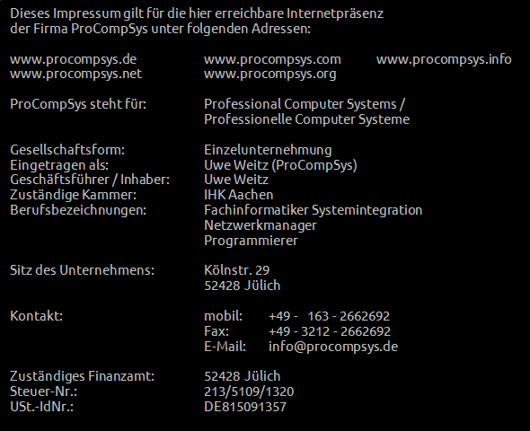Das Internetangebot wird mit größtmöglicher Sorgfalt zusammengestellt und gepflegt. Eine "Garantie" für die Fehlerfreiheit, Genauigkeit und Vollständigkeit der Angaben kann ProCompSys jedoch nicht übernehmen und schließt daher eine Haftung für Verluste oder Schäden jeder Art, die direkt oder indirekt aus der Nutzung des Online-Angebotes dieser Website entstehen, aus. Ebenso übernimmt ProCompSys keine Haftung für Website-Angebote anderer Betreiber, zu denen Besucher dieser Website über hier eingefügte Links (Verknüpfungen) gelangen können. Für diese Fremd-Inhalte sind ausschließlich deren Anbieter zuständig und verantwortlich, und das Aufsuchen dieser Webseiten bzw. das Anzeigen und die Nutzung dieser Inhalte erfolgt ausschließlich auf eigene Gefahr des Benutzers.